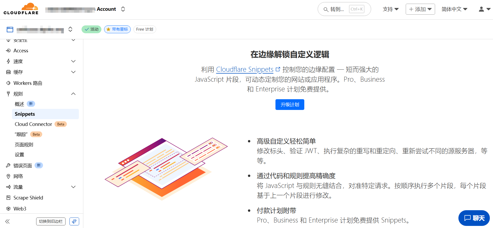 如果提示 升级计划 说明当前域名不具备Snippets功能,请继续往下看备用方案。