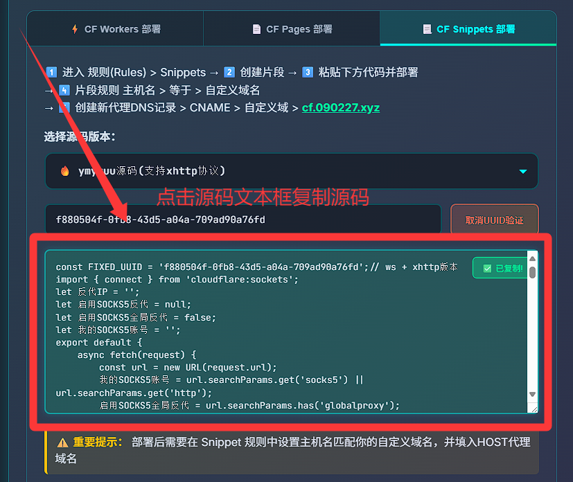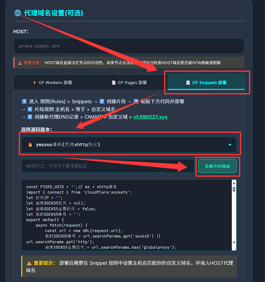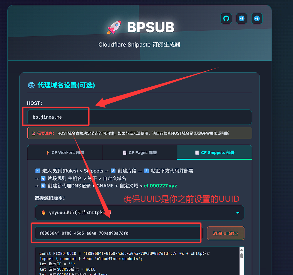 前往 BPSUB 网站 ,点击 CF Snippets 部署,选择你心仪的源码并点击 生成UUID验证 。