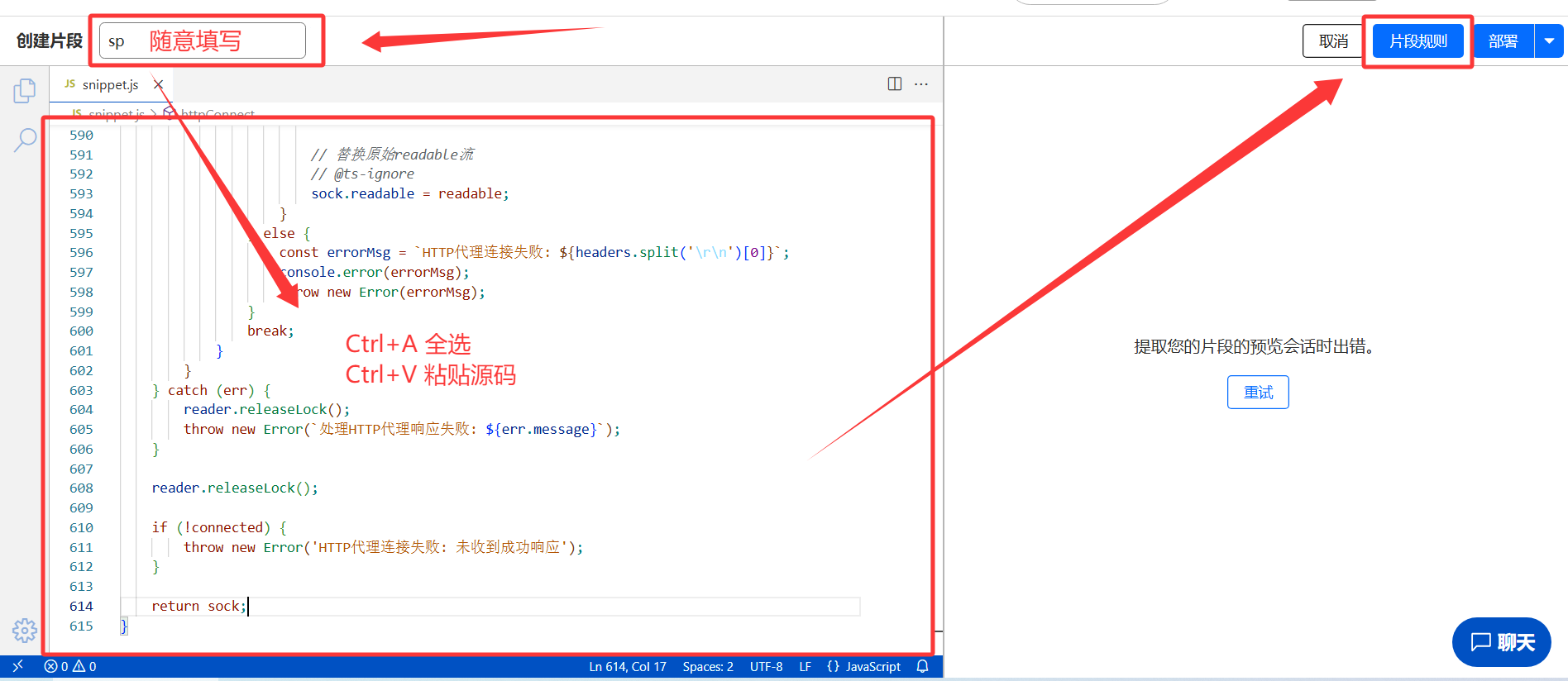 Ctrl + A全选后Ctrl + V粘贴源码,并点击片段规则。