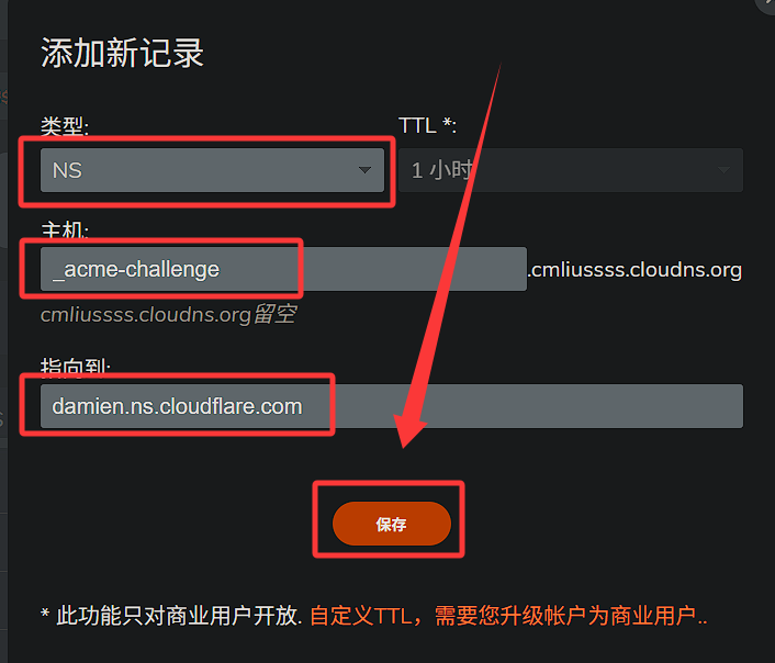 NS记录 > 主机_acme-challenge> 指向到你的NS记录值> 保存。
